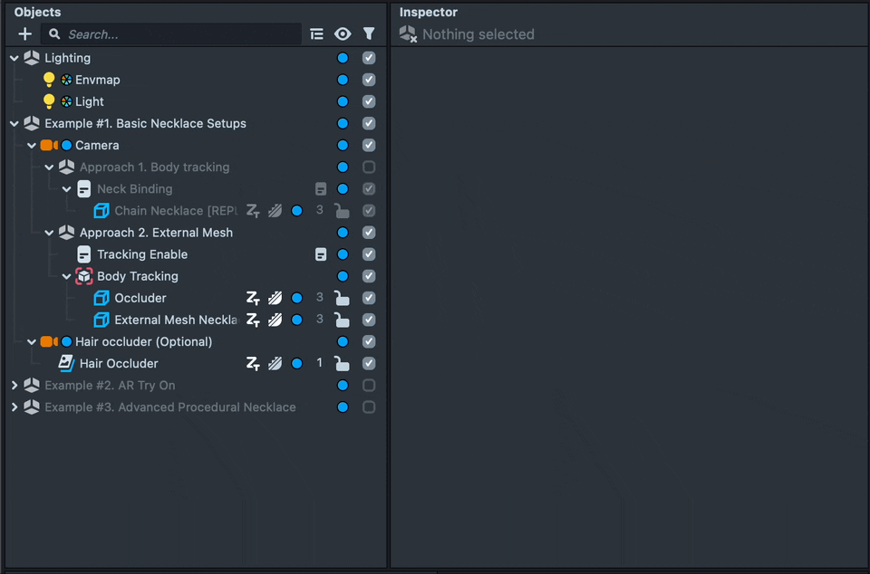 In Approach 1, we created a script called Neck Binding which does all the heavy lifting of setting body tracking, adding chest and neck colliders, a body occluder and setting the hierarchy - all necessary to bind the necklace to the neck. We used this script for Example #2 and Example #3 as well.