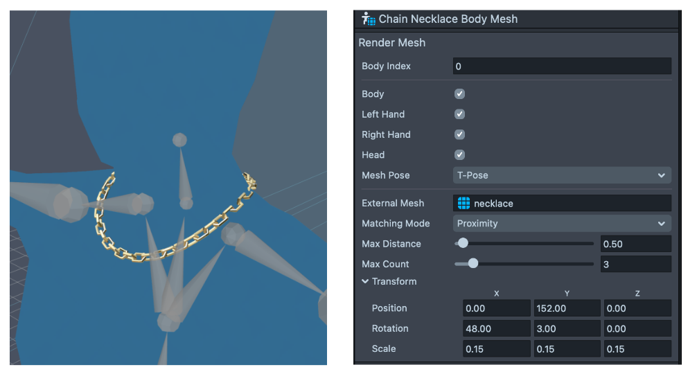 Although the previously mentioned body tracking approach is generally recommended, users can also prepare necklaces through an external mesh in the scenario where a user desires the necklace model to deform and match the body's contours.