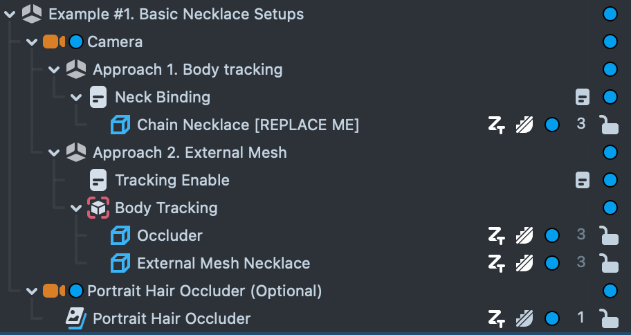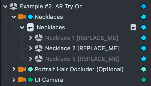 This example features three necklaces, using the above mentioned body tracking approach. It features three cameras, the first responsible for the necklaces. The second camera - Hair occluder, as above, renders longer hair over necklaces as a 2D image. The third camera is responsible for the UI carousel and UI logic.