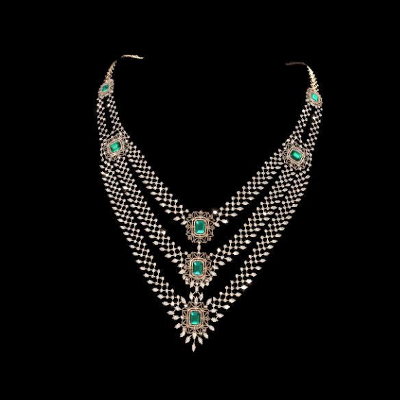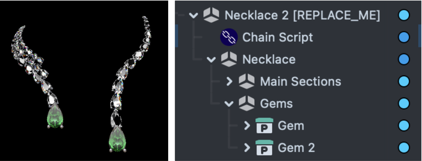 The first necklace is a simple static model (consisting of multiple meshes grouped together) similar to the first example. The gemstones in this necklace are using the Gemstone Rendering custom component for high fidelity. Read more about Gem Rendering in the following documentation