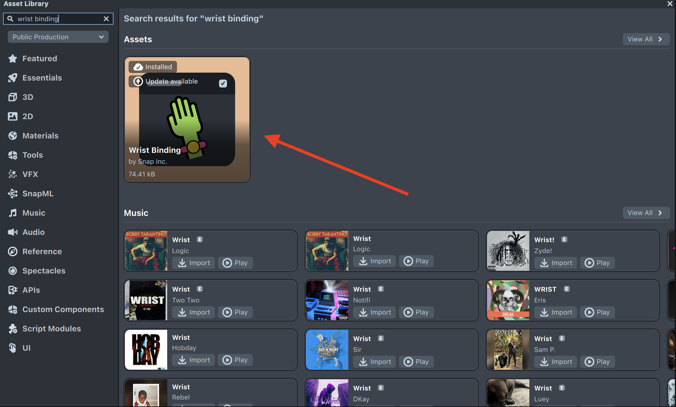 3. In the Asset Library Search Bar, type in "Wrist Binding". The "Wrist Binding Custom Component" should be visible in the Asset Library window. Click on Install.