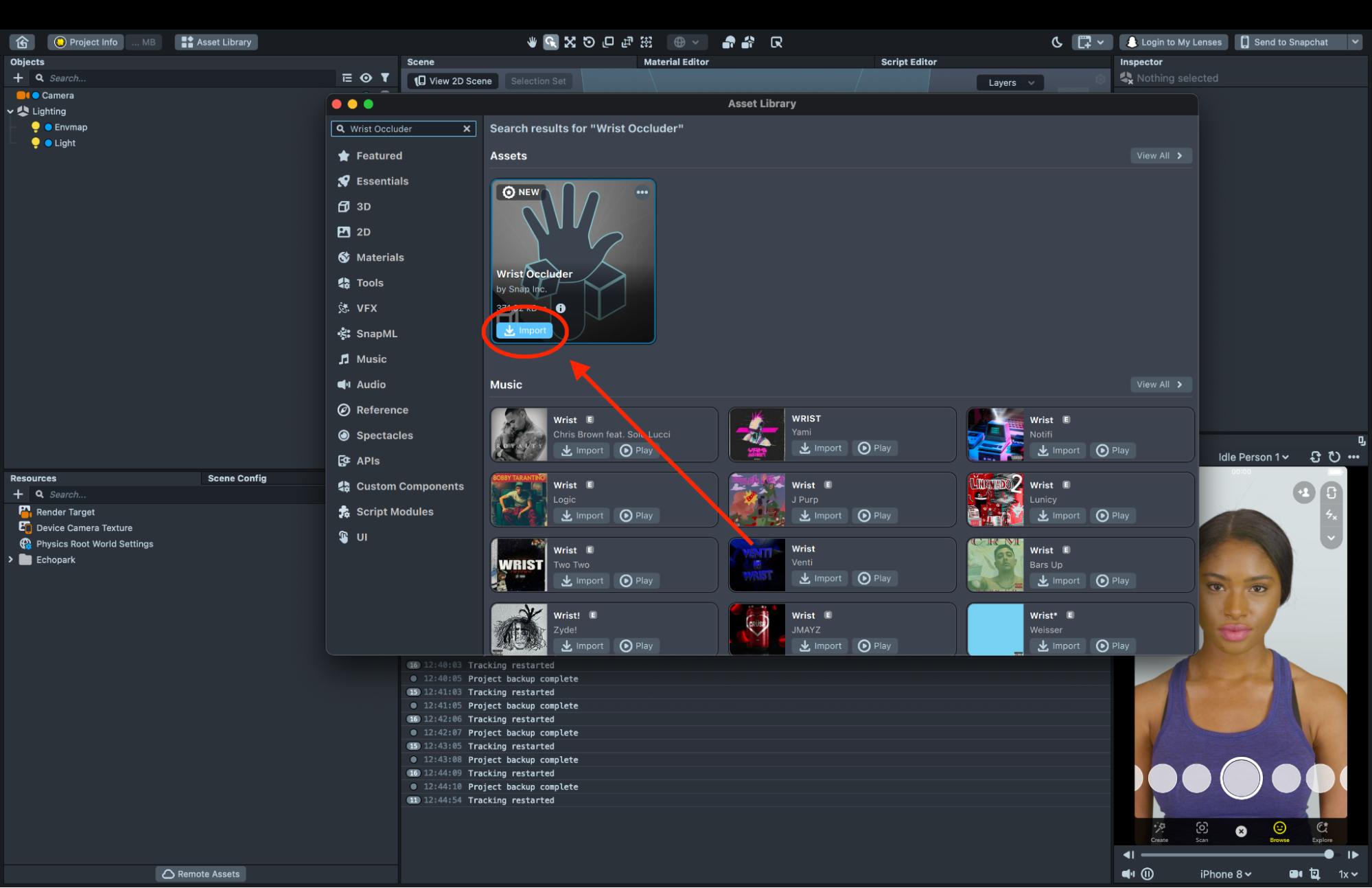 4. Type in "Wrist Occluder" in the Asset Library search bar and select Import on the "Wrist Occluder" asset.