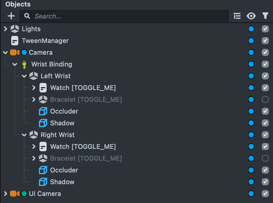 • The Watch [TOGGLE_ME] and Bracelet [TOGGLE_ME] Scene Objects are examples that demonstrate how to create your own Try-On AR experiences.