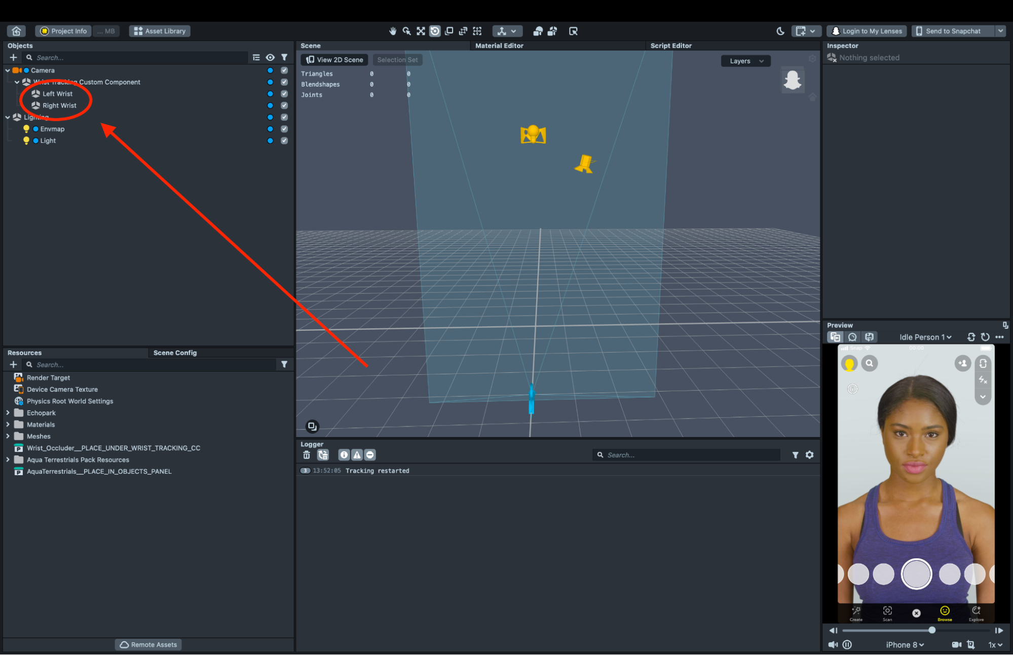 With all the necessary assets imported into your Lens Studio project, you can start setting up the Wrist Binding Components. The first step is to create the scene hierarchy in the Objects panel, the second is populating the hierarchy with scripts and assets.