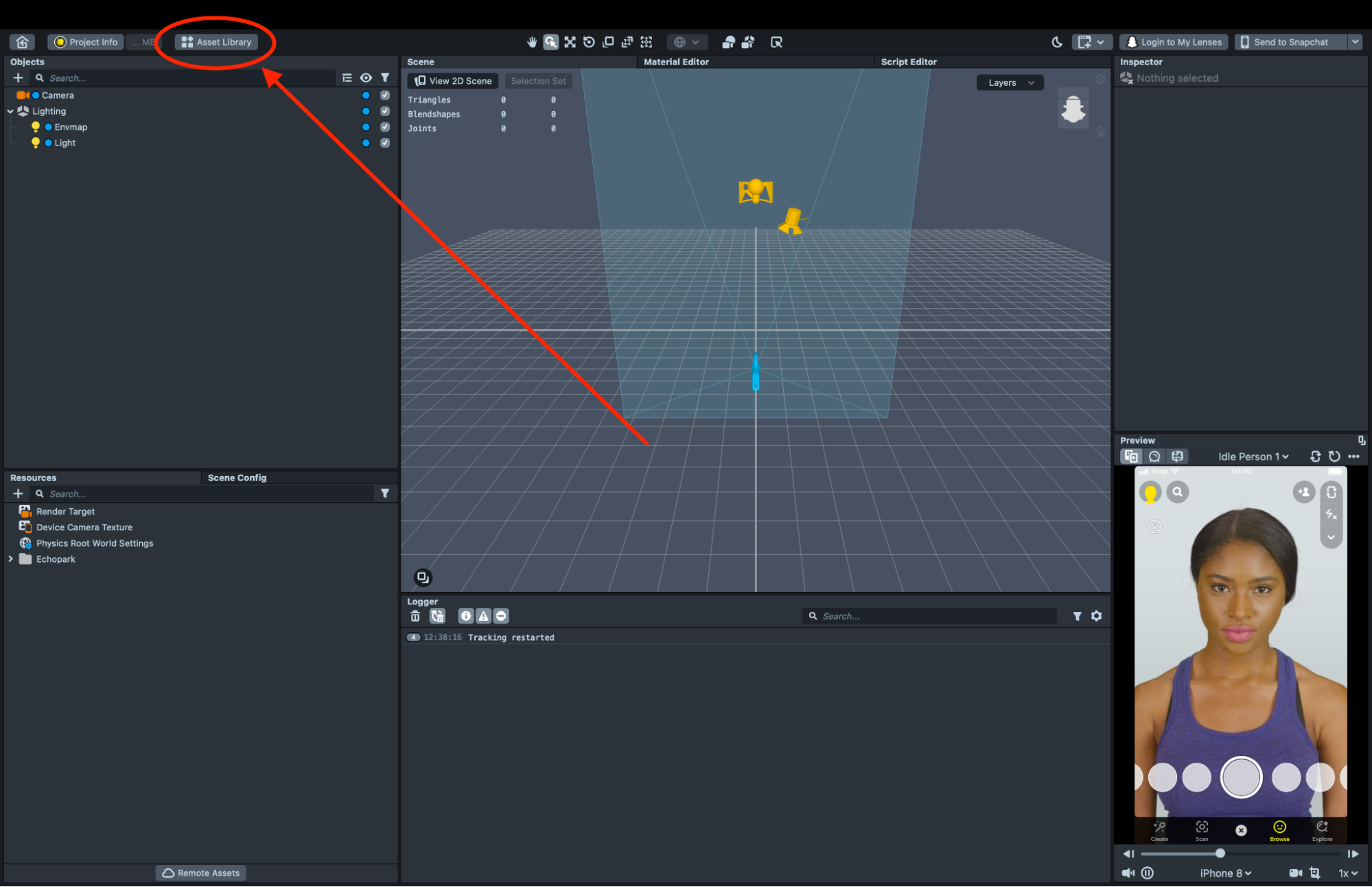2. Left-click on the Asset Library button, located above the Objects panel.