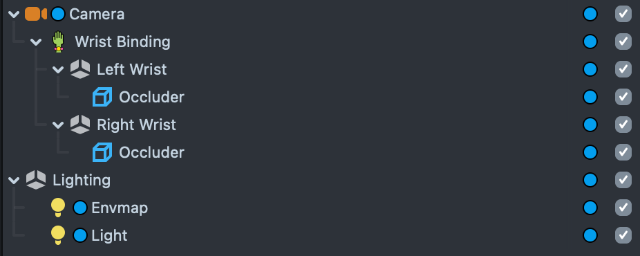 1. Click and drag the Wrist_Occluder__PLACE_UNDER_WRIST_BINDING_CC asset from the Resources Panel into the Objects Panel. You should now see two Wrist Occluders appear in the Scene Panel.