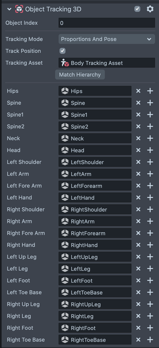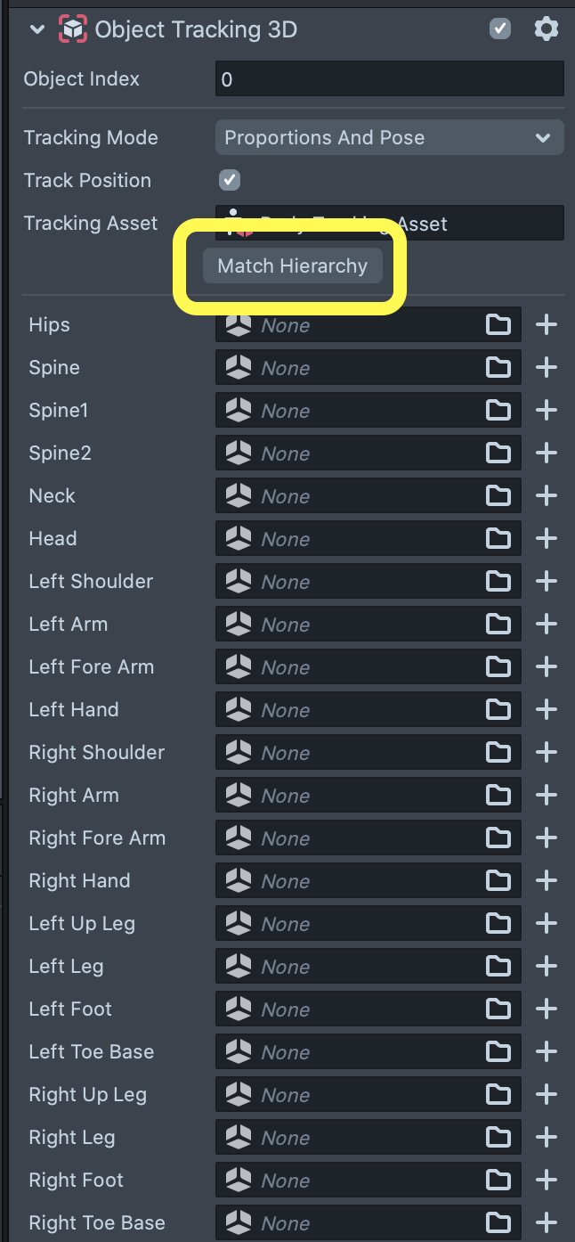 With your model placed under the Object Tracking 3D object, you can select the object and link the joints of our character to the joints of the body. To do this, in the Inspector panel, press the Match Hierarchy button in the Inspector panel.