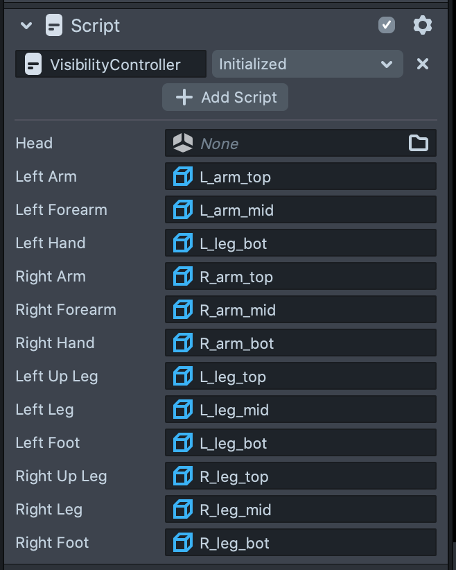 However, if you have the mesh in its separate group and not referenced by the Object Tracking 3D Component, you will need a simple script that will disable the pieces of the mesh if the corresponding joint is disabled. You can see an example of that script attached to the body tracking scene objects in the Spacesuit scene object hierarchy.
