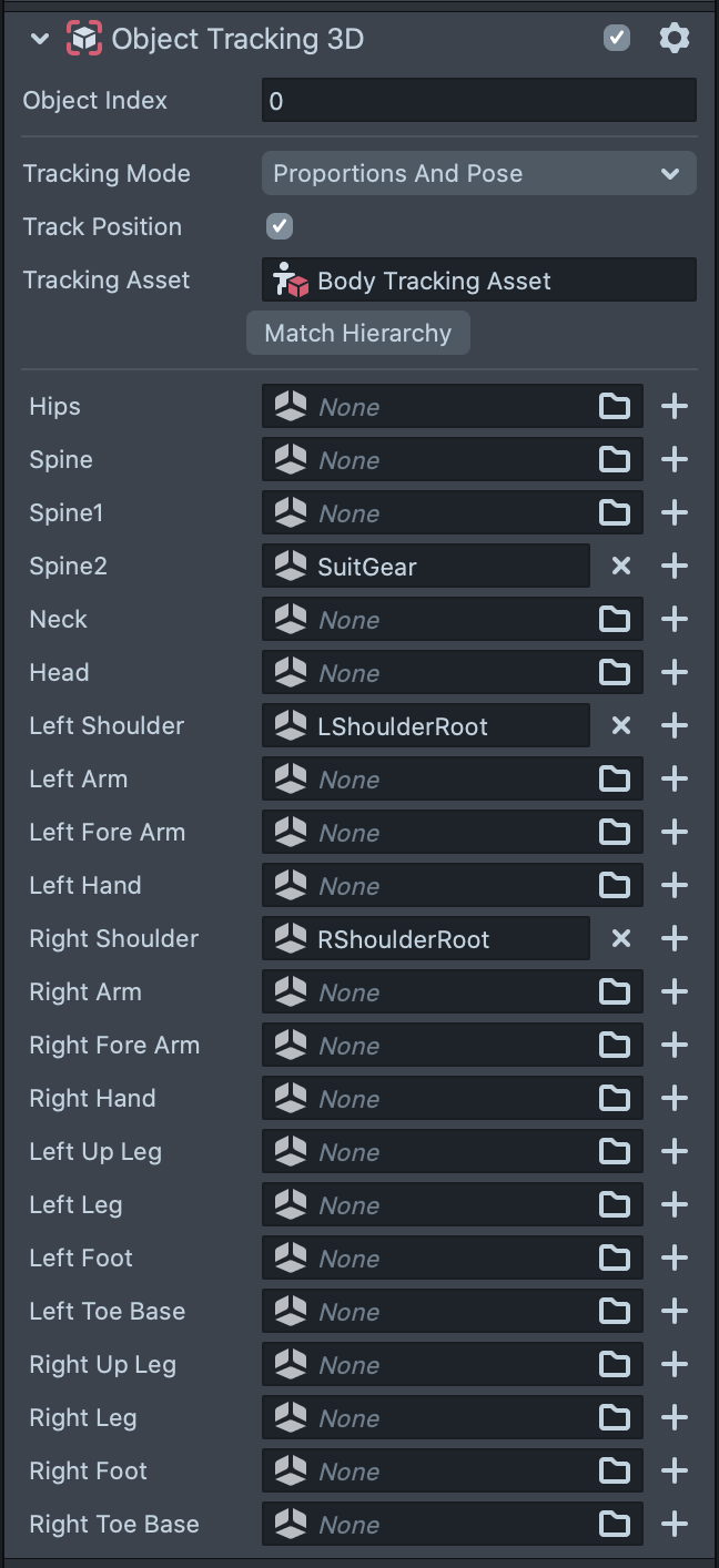 In the Inspector panel, you'll see that this object has an Object Tracking component which has a mapping of the model's joint, to the trackers'.
