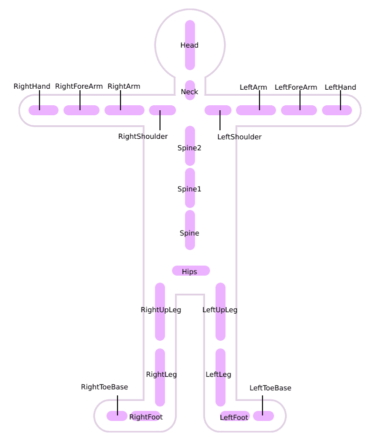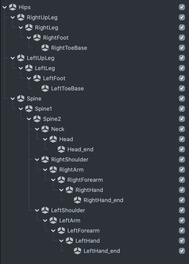 Optionally, the 3D Body tracker can also track joints in the user hand. Standard rigging hierarchy is added to support movement in the hands: