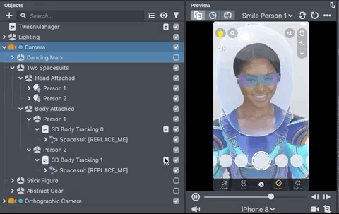 In the Preview panel, you can see how the 3D model's proportion is modified based on the two Snapchatters in the camera.