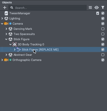 First remove the Stick Figure [REPLACE_ME] scene object, and parent your character to the 3D Body Tracking 0 object. Then, drag your 3D model from your computer to the 3D Body Tracking 0 object to make it its child.