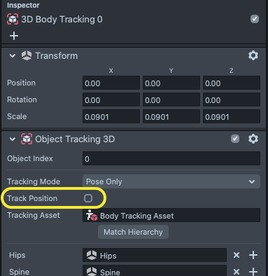 Note that any child scene object of the root scene object of your character will also affect placement and scale of the skeleton even if Proportions And Pose mode is active. In other words, in Proportions And Pose, only the scene object with the Object Tracking component on it (3D Body Tracking scene object in our case) does not affect placement of the character. Any other transforms, except for Hips, upper and lower in the hierarchy that affect placement of the skeleton will keep affecting it.