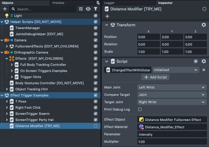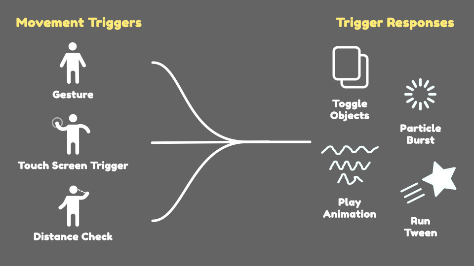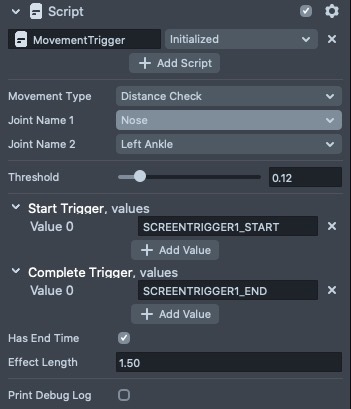 - Triggers: This can be body gesture, distance check between body joints, or distance check between body joints and a screen transform