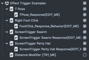 Under each object in Effect Trigger Examples, there is a Response object with a MovementTriggerResponse script.