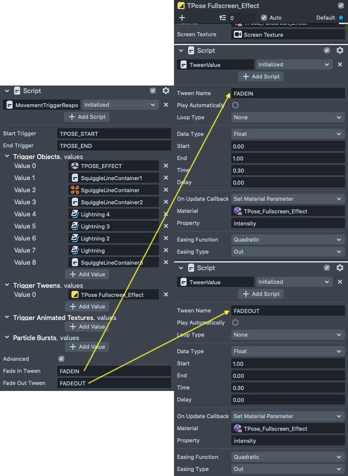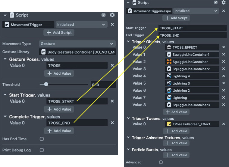 Each response object handles calling the visual effects for each trigger. They communicate through a Behavior Custom trigger string. We need to make sure that the Start and End trigger strings match each other in the MovementTrigger and MovementTriggerResponse script.