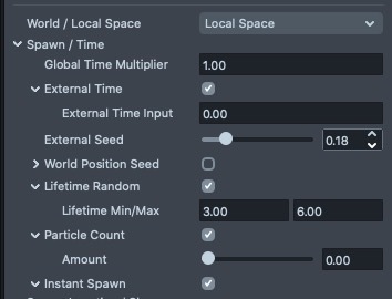 ParticleControllerHelperscript attached will have a ‘burst’ effect triggered when the trigger starts. Make sureExternal TimeandInstant Spawnare both checked on the Particle System material so that theParticleControllerHelperscript can modify the parameters.