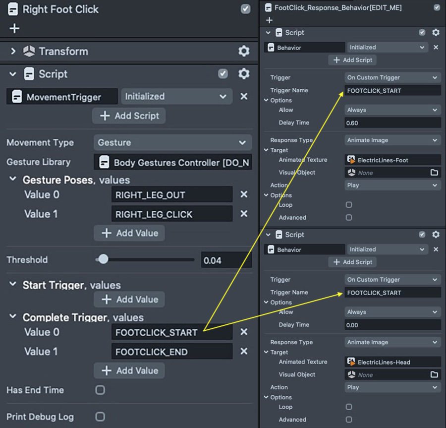 You can also respond to Movement Triggers by using Behavior scripts. For example, on the FootClick_Response_Behavior object, all animations and fullscreen effects are triggered with Behavior scripts.