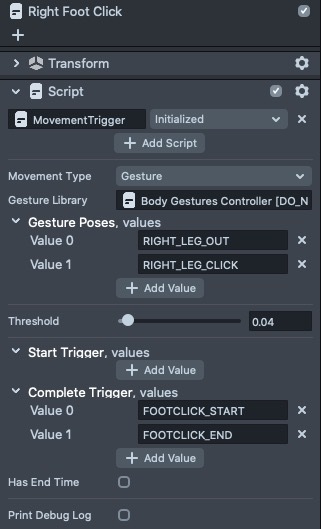 Each Gesture is composed of a list of pose triggers listed in the Gesture Poses input field. For example, the pose triggers for Right Foot Click are RIGHT_LEG_OUT and RIGHT_LEG_CLICK. Each of these poses are defined in the GesturesLibrary script.