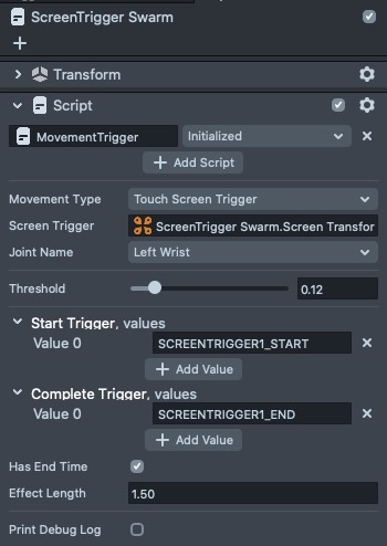 Because screen trigger is instantaneous in comparison to gesture trigger, the effect here often checks Has End Time and is given an Effect Length.