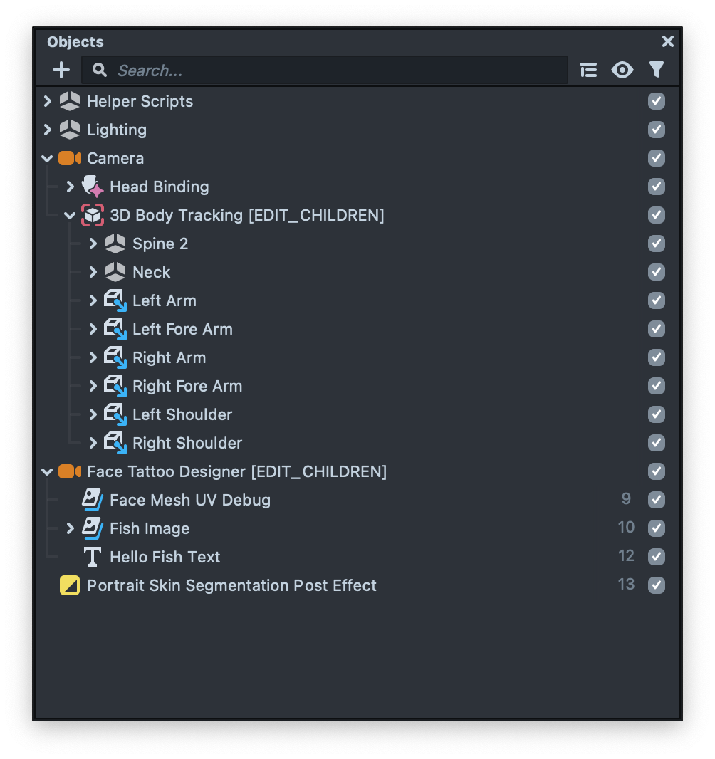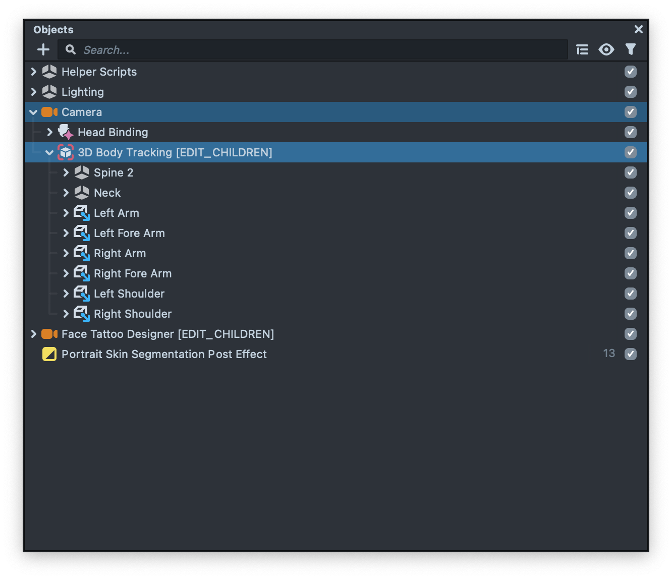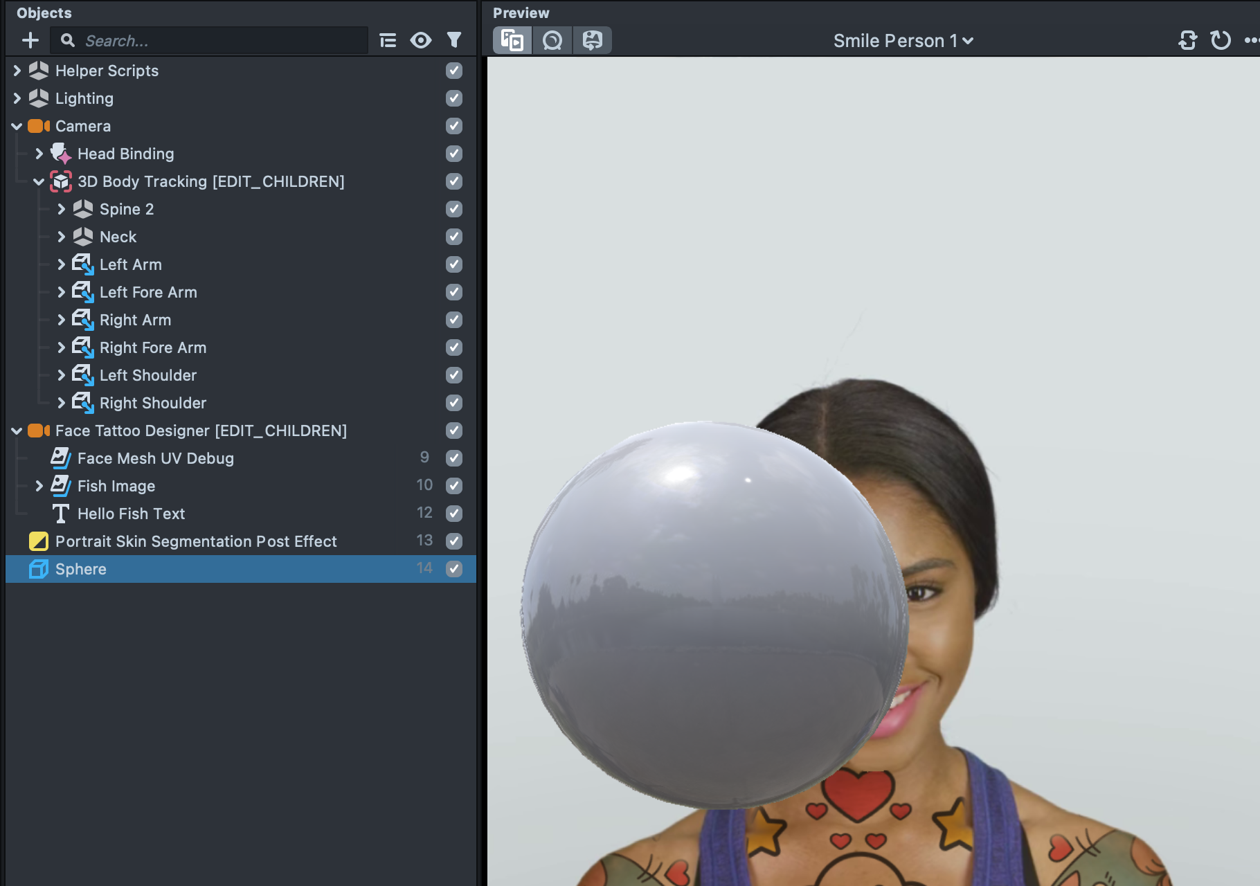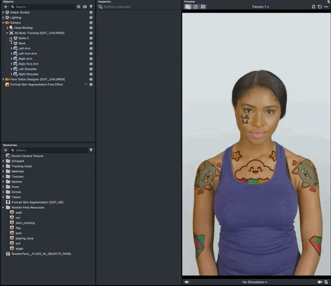 The Portrait Skin Segmentation template lets you easily segment skin in the camera view and replace it with an image, text, 3D models, post effects and more. This template comes with body tracking to help you easily attach your art to the skin.