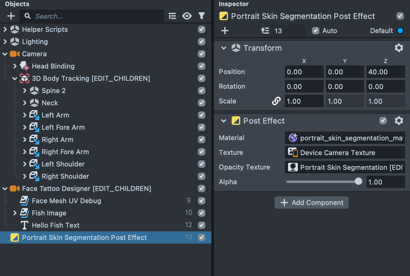 The Objects Panel has a post effect object called Portrait Skin Segmentation Post Effect.