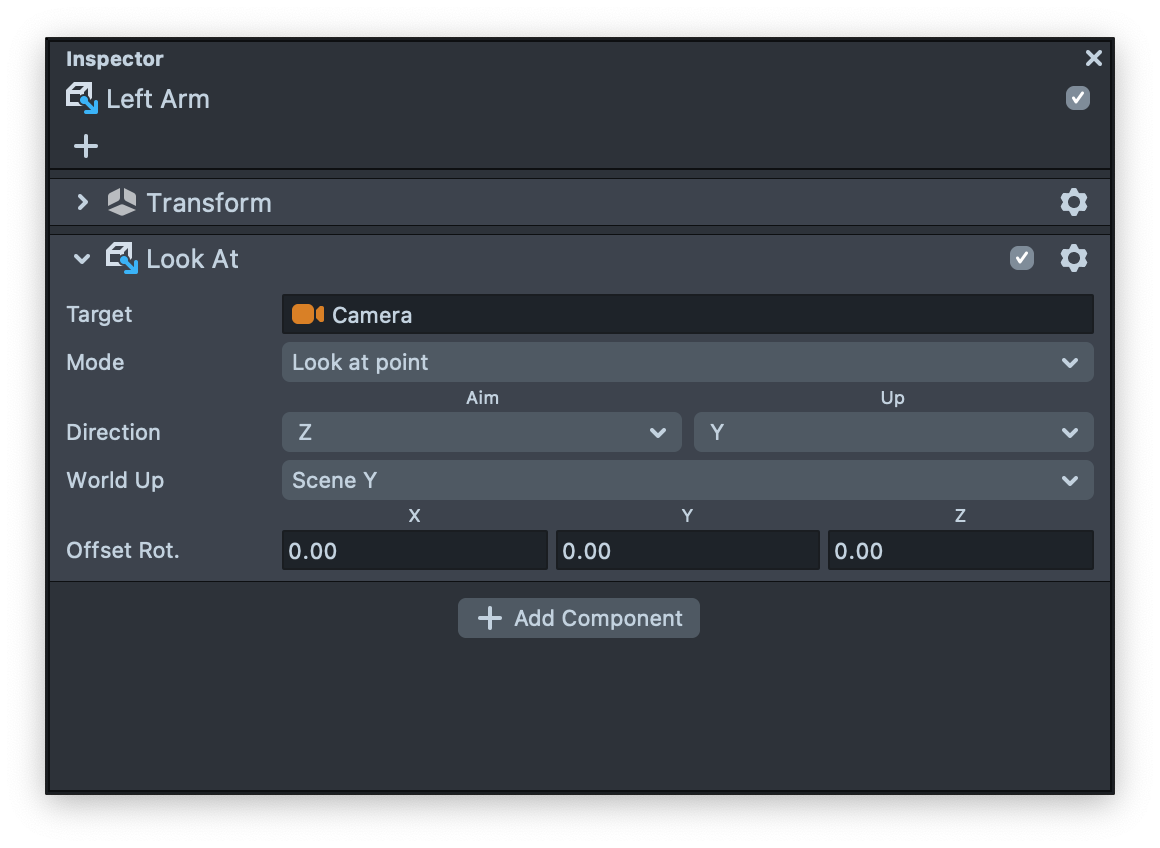 Tacked objects include a Look At component. This component makes sure all child objects always face the camera. This component is optional.