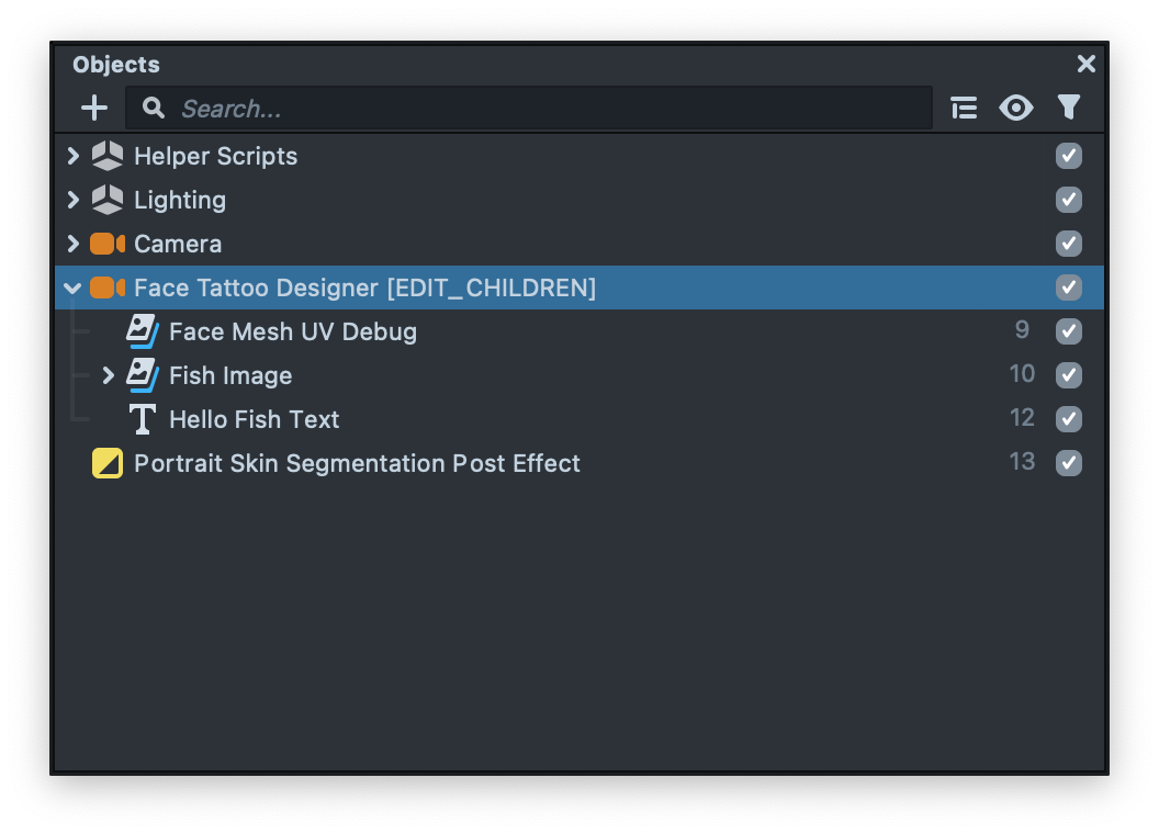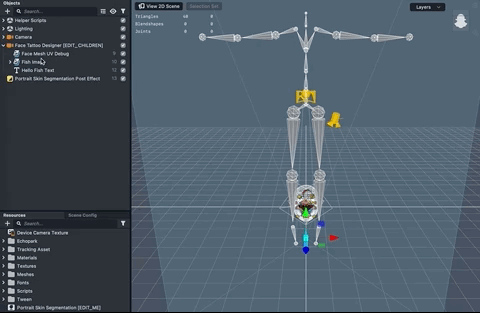 To make your objects appear on the face mesh, place any content as a child of the Face Tattoo Designer [EDIT_CHILDREN] and adjust the transform of the object on the face.