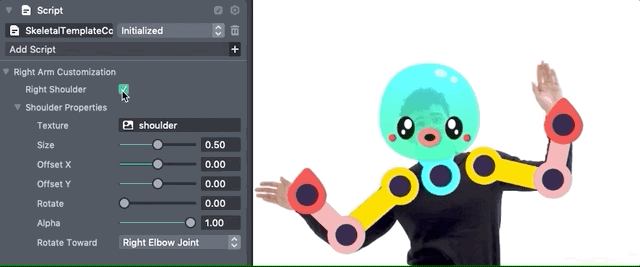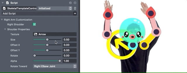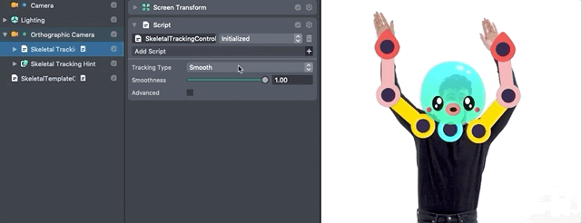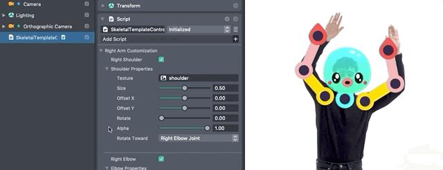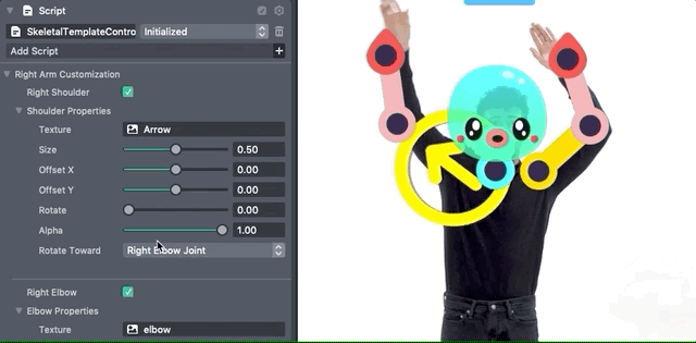The Skeletal template allows you to track images to specific joints of the user's body. You can set your 2D images to track the user's head, neck, shoulders, elbows, and hands. Each image can be toggled on and off, as well as offset or resized. Additionally, you have the option to smooth out the tracking of each joint.