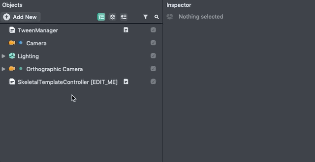 First, select the SkeletalController [EDIT_ME] object in the Objects panel to see its settings in the Inspector panel.