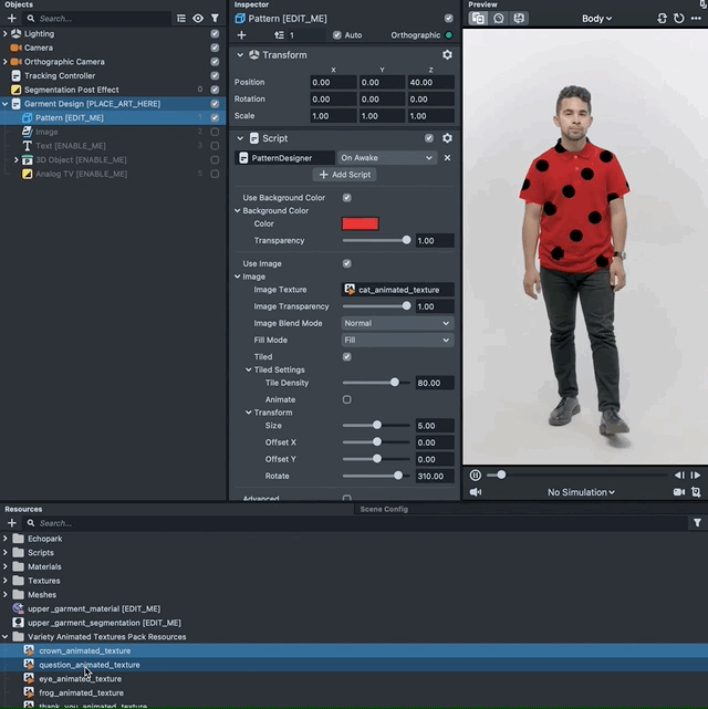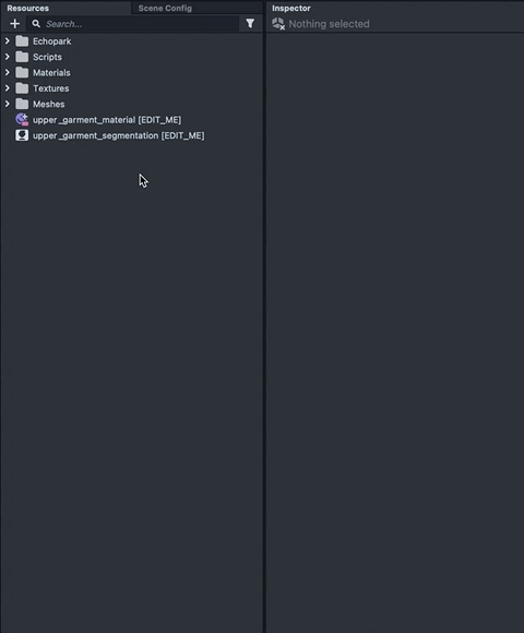 To modify what part of the image is segmented, modify the segmentation texture resource found in the Resources panel. To do this, select the upper_garment_segmentation [EDIT_ME] object, and in the Inspector panel, modify its settings.