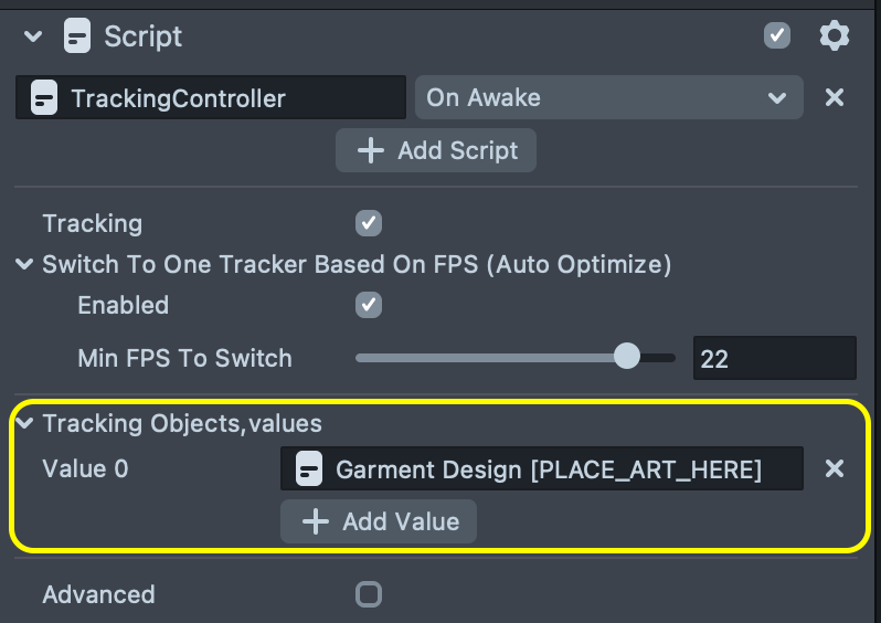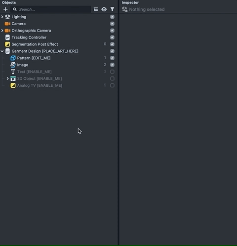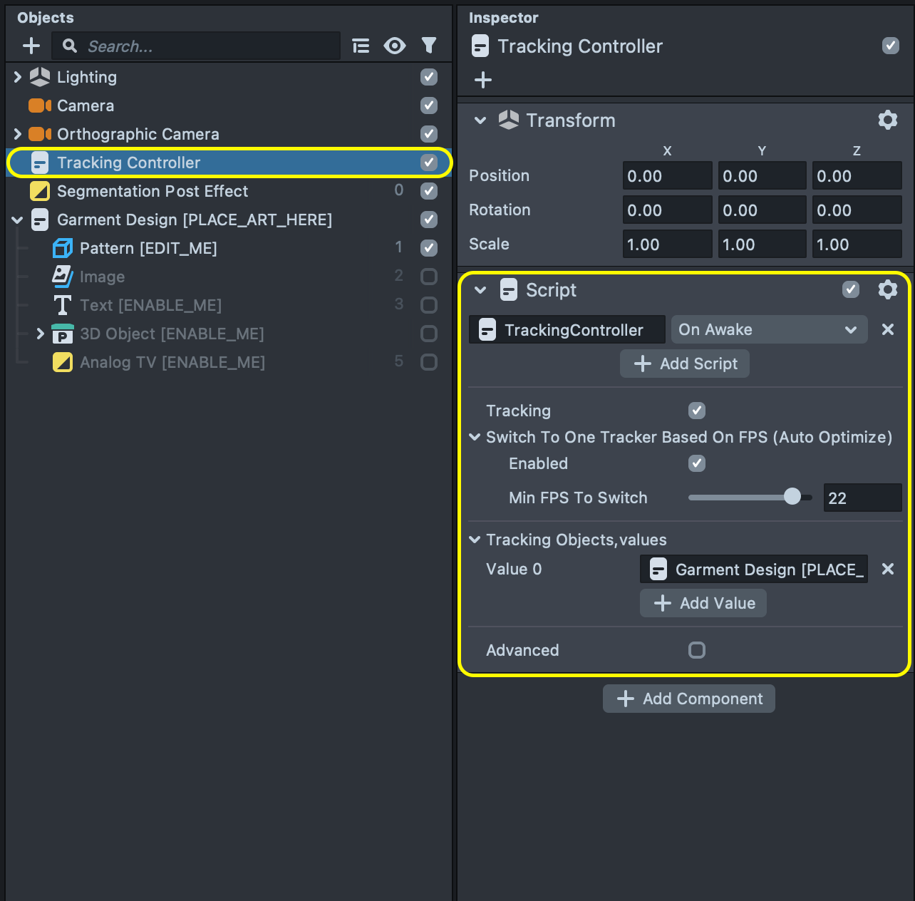 This script helps you to track all your objects on the garment. To modify it settings first select the Tracking Controller in the Objects panel and modify the values in the Inspector panel.