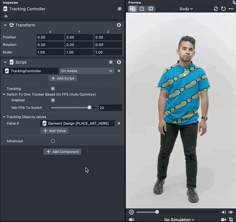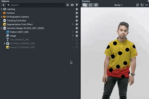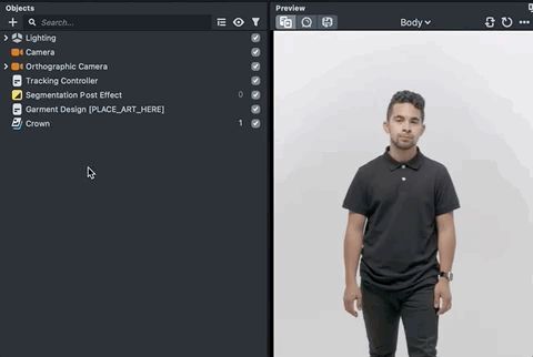 You can select and specify what objects are tracked to the body using the Tracking Objects. The Garment Design [PLACE_ART_HERE] object is already set as a tracking object to make the process easier.