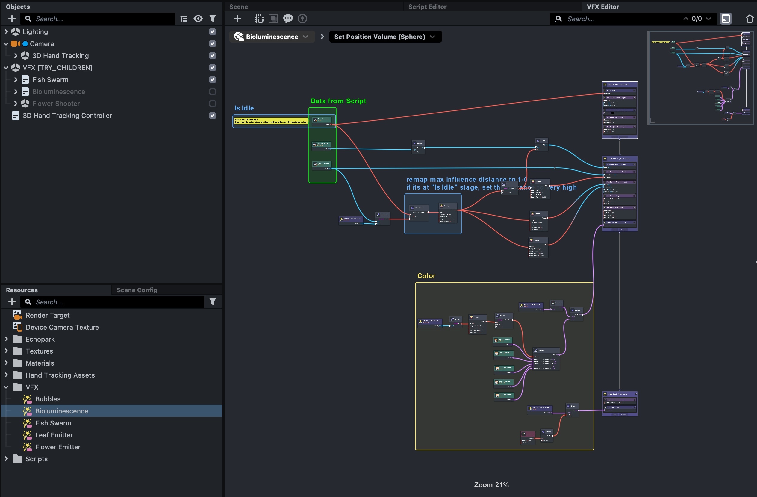 For example, the tracked 3D Hand position is changing the InfluencePosition of the VFX graph with the HandPositiontoVFX script.