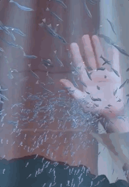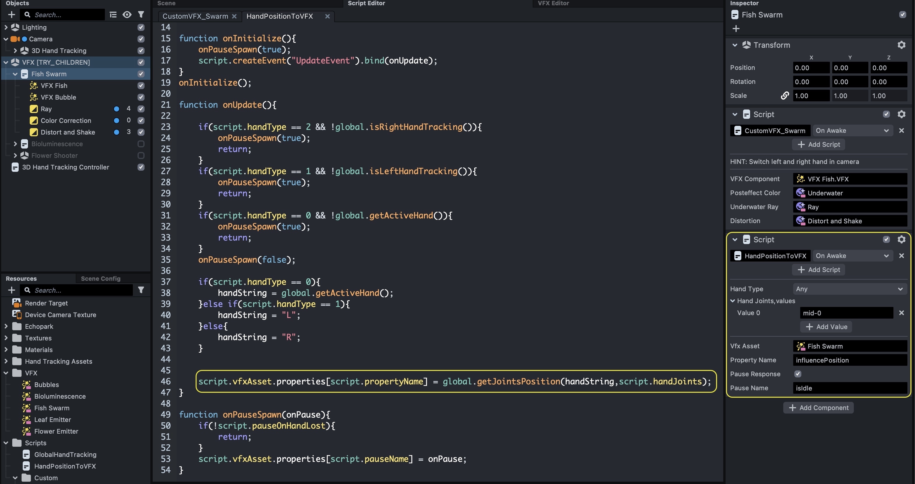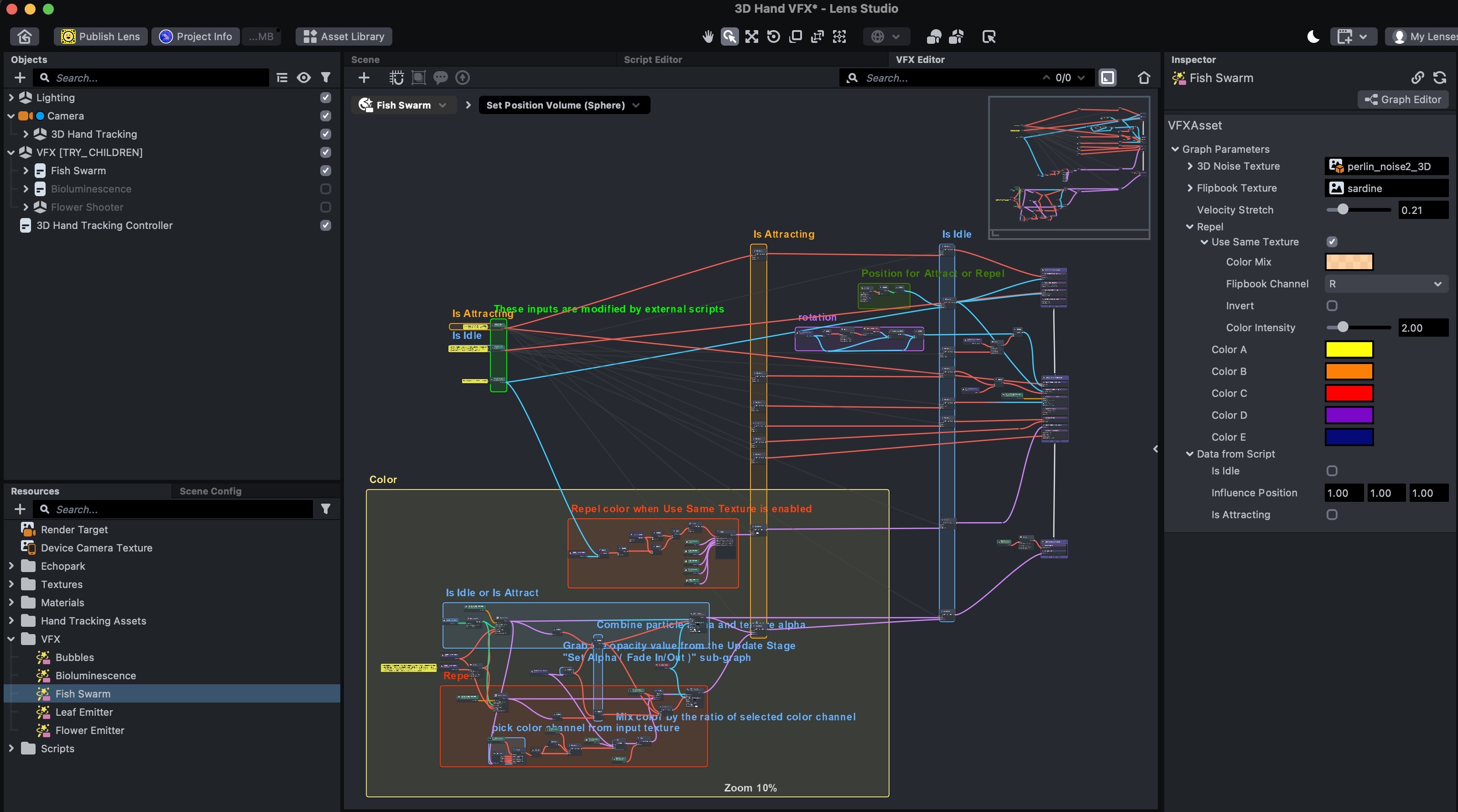 The Fish Swarm example allows you to influence a fish swarm created in the scene with your left and right hand. Our right hand attracts the fish swarm and left hand repels it. You can explore the Fish Swarm graph to see how the sardine swarm effect is made.