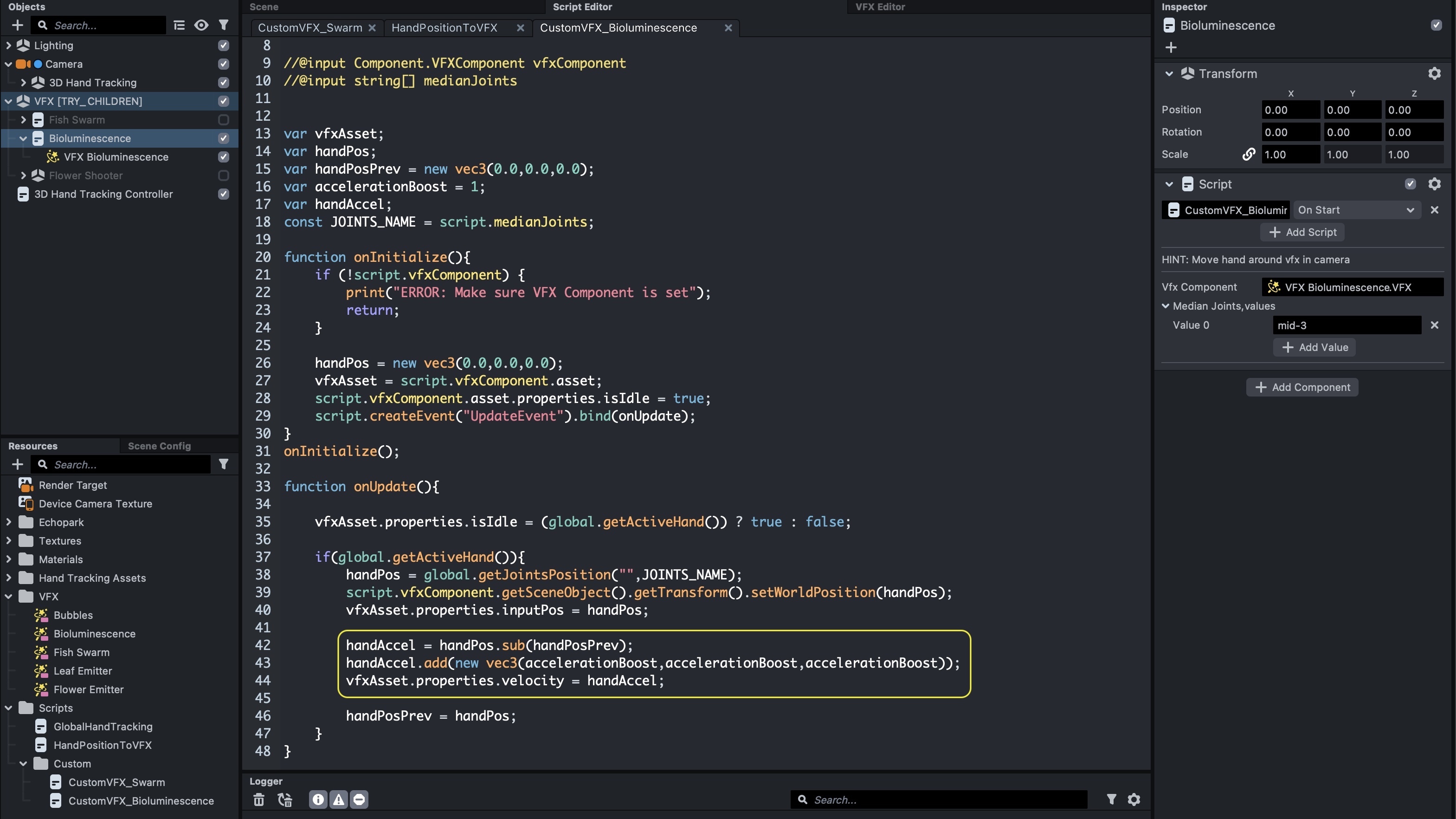 - Bioluminescence - Using acceleration of hands to add color highlight and force to a VFX graph.