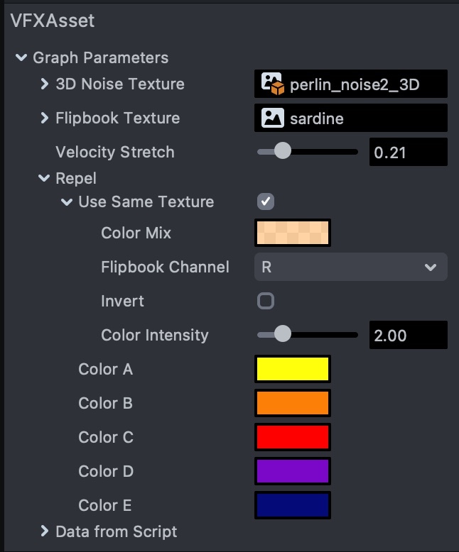 Color A to E is a set of gradients that you can apply to the texture when the repel action is happening.