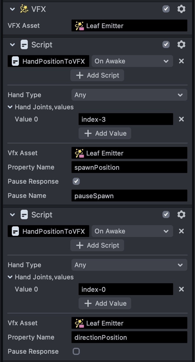 In both the Flower Emitter and Leaf Emitter VFX graphs, there are SpawnPosition and DirectionPosition input parameters. The HandPositionToVFX script assigns the index tip’s position to SpawnPosition and the index middle’s position to DirectionPosition so that the shooters always shoot to where the index finger is pointing. Feel free to change these parameters and see what happens.