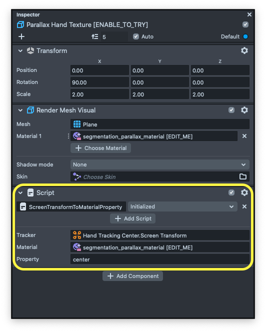 This example uses a helper script called ScreenTransformToMaterialProperty to get a position data from Hand Object Tracking and then convert that data into a screen point.