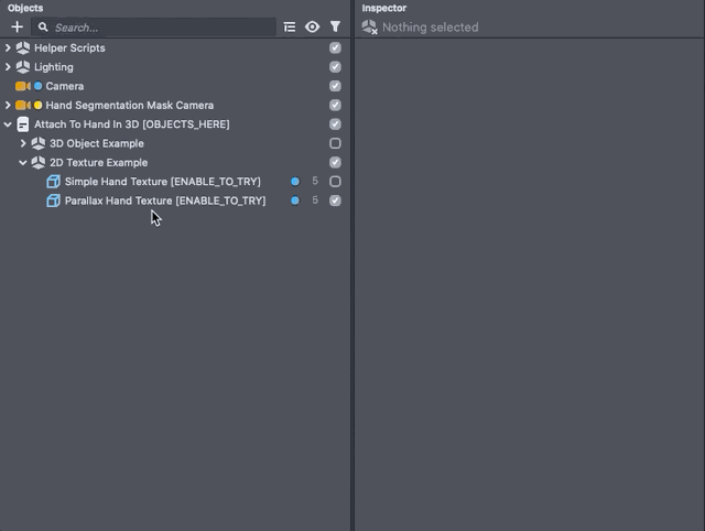 To customize, select the Attach To Hand In 3D [OBJECTS_HERE] object in the Objects panel and adjust it’s setting in the Inspector panel.