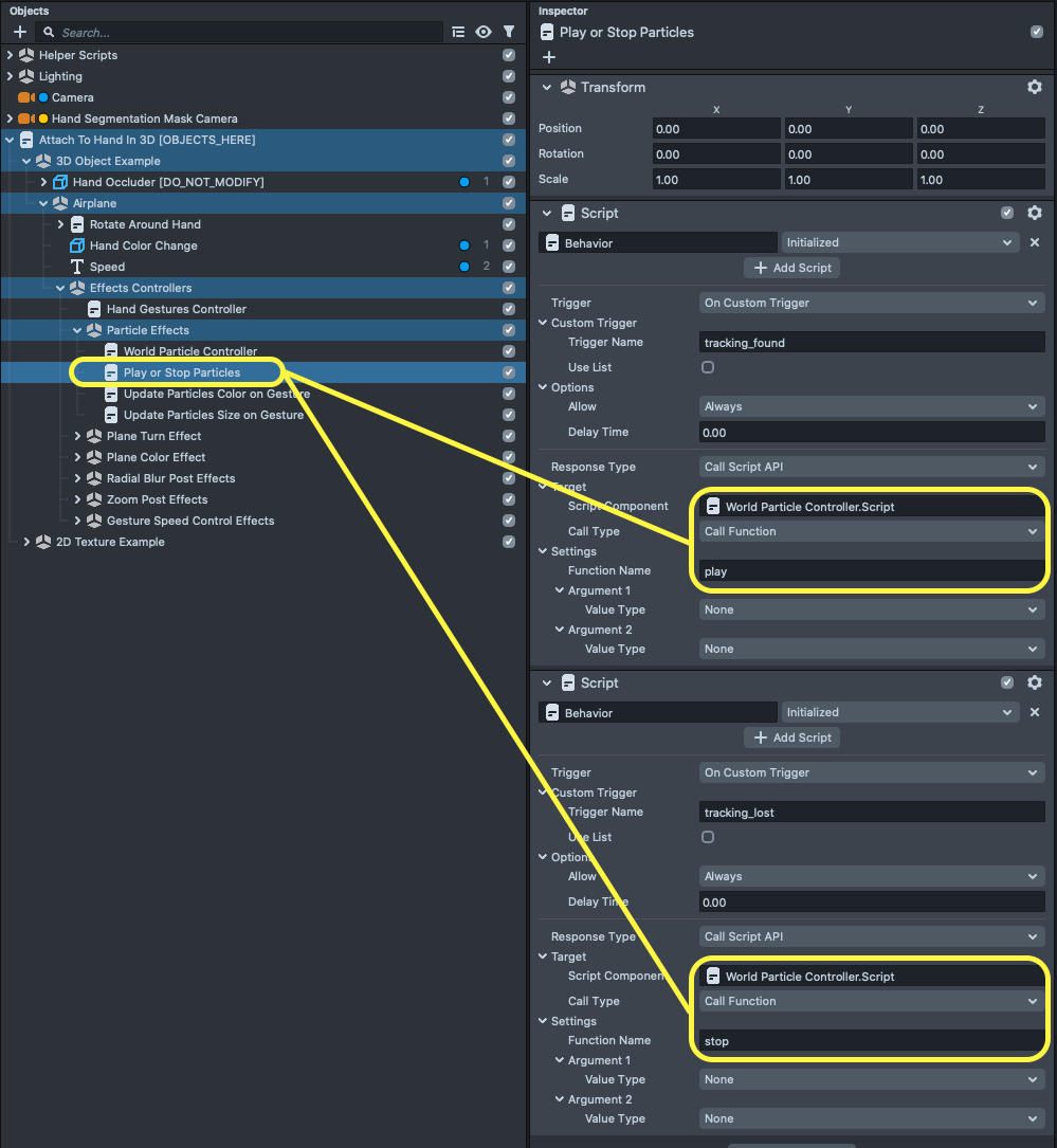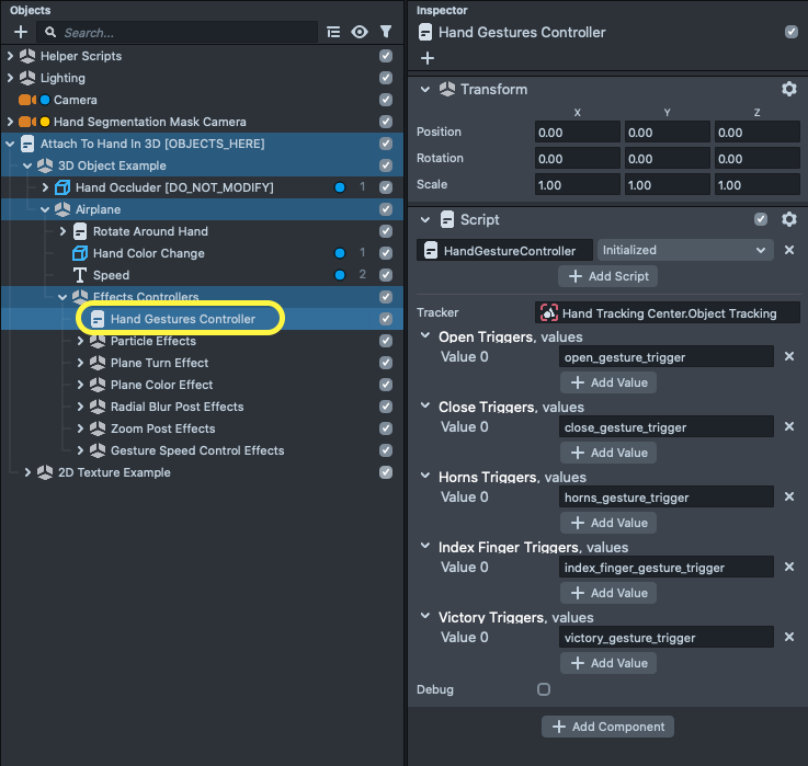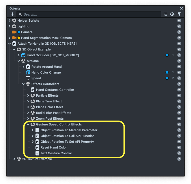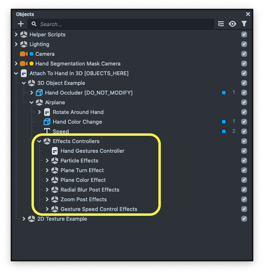 You can find these effects in the Object panel, under the Attach To Hand In 3D [OBJECTS_HERE] -> 3D Object Example -> Airplane -> Effects Controllers.