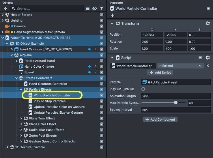 The way world particles work is that we used the same particle system which comes with the Lens Studio. Then we have a helper script in the template called WorldParticleController. With this helper script you can assign your particles effect and then this script creates copies of the same particle and places it in the scene.