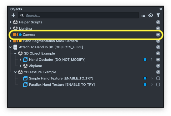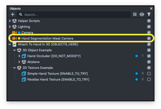 This means that the camera uses a render target to render the hand segmentation to it. You can find the Render Target in the Resources panel, under the Textures folder, called Mask Camera Render Target.