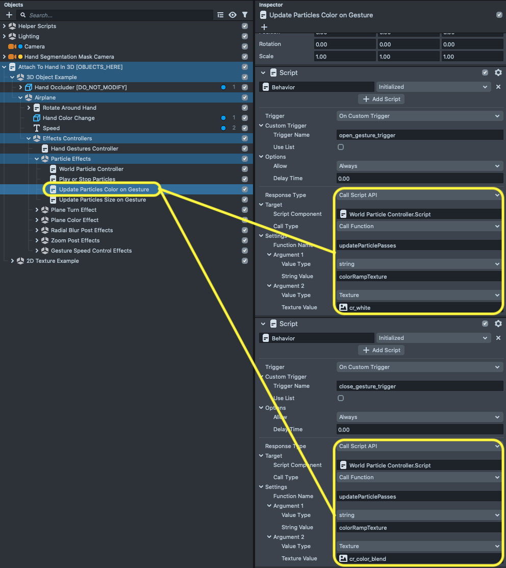 To change the color of the particles you can use a behavior script and call the updateParticlePasses function. When you call this function make sure to pass a pass name as well as a value related for the pass you want to change. In our example, we modify the colorRampTexture of the particle material.