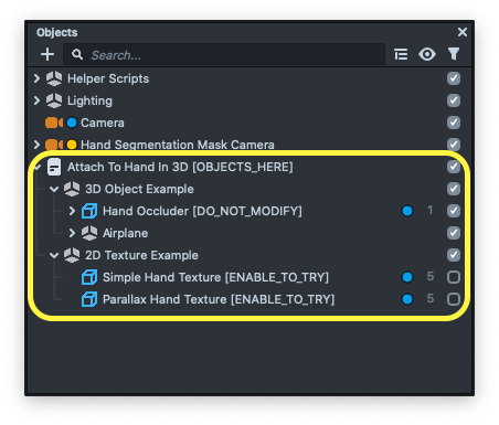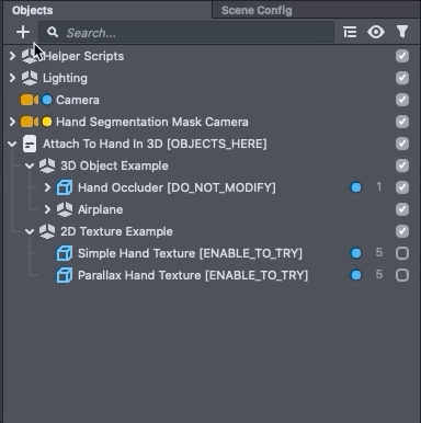 Then place the Attach To Hand In 3D [OBJECTS_HERE], Hand Segmentation Mask Camera as well as Helper Scripts as a child of newly created objects.