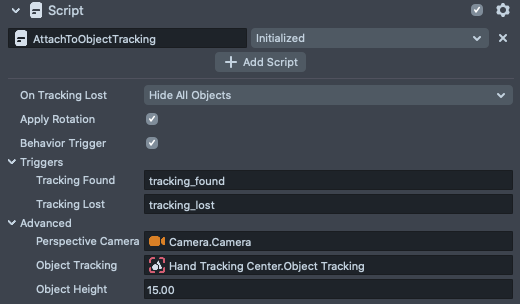 This script can send triggers to the behavior script as soon as hand tracking starts tracking or lost tracking.