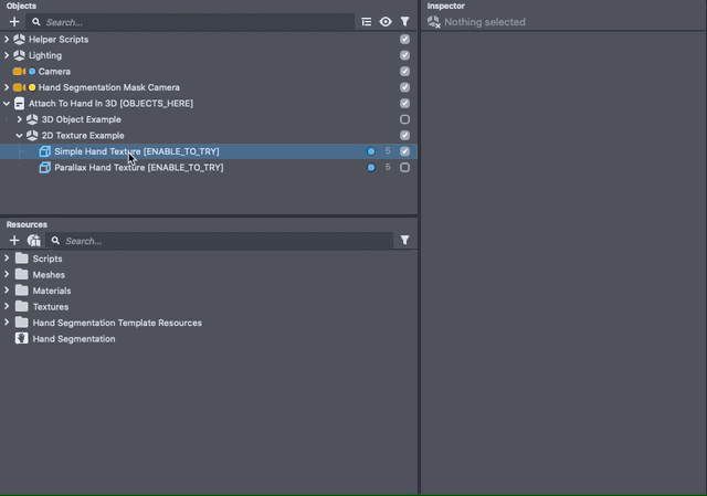 As mentioned before, the project contains the hand segmentation under the Hand Segmentation Mask Camera, as well as the Attach To Hand In 3D [OBJECTS_HERE] object which contains the actual visuals. You’ll need to export both pieces in order to export the template. In addition the animations are run through the Tween system found under Helper Scripts object.