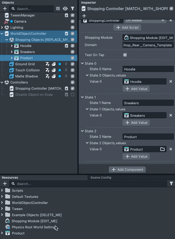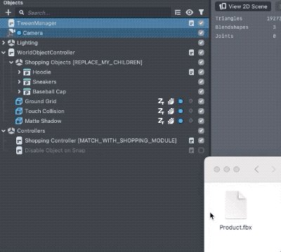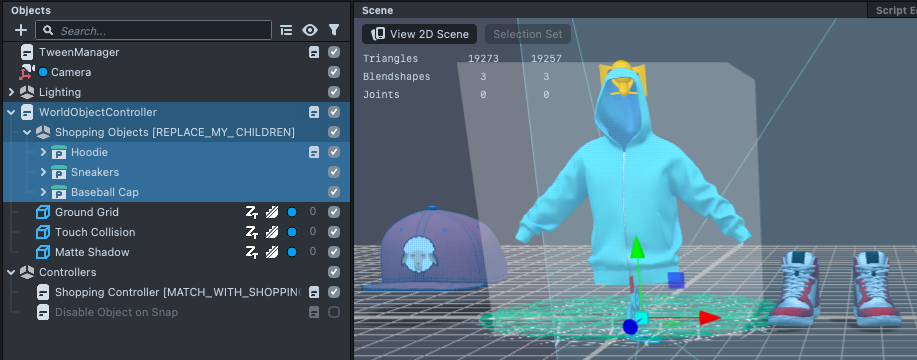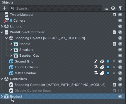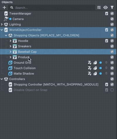 Each Shopping Lens contains all the AR visuals needed to display your product. In the template, we have a Hoodie, Sneakers, and Baseball Cap as our product. They are listed in the Objects panel, under Shopping Objects.