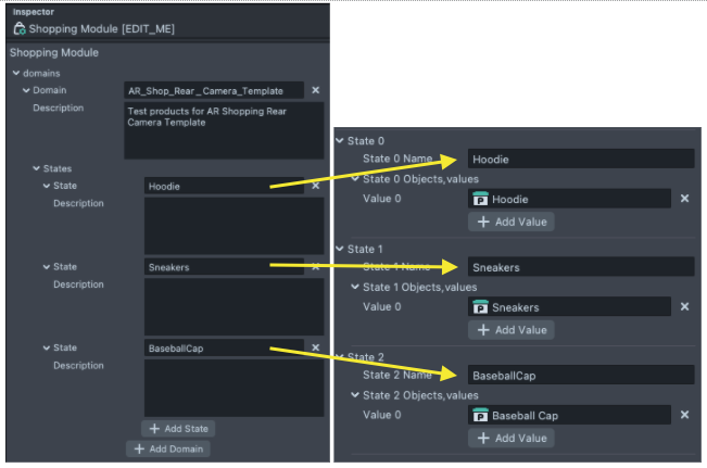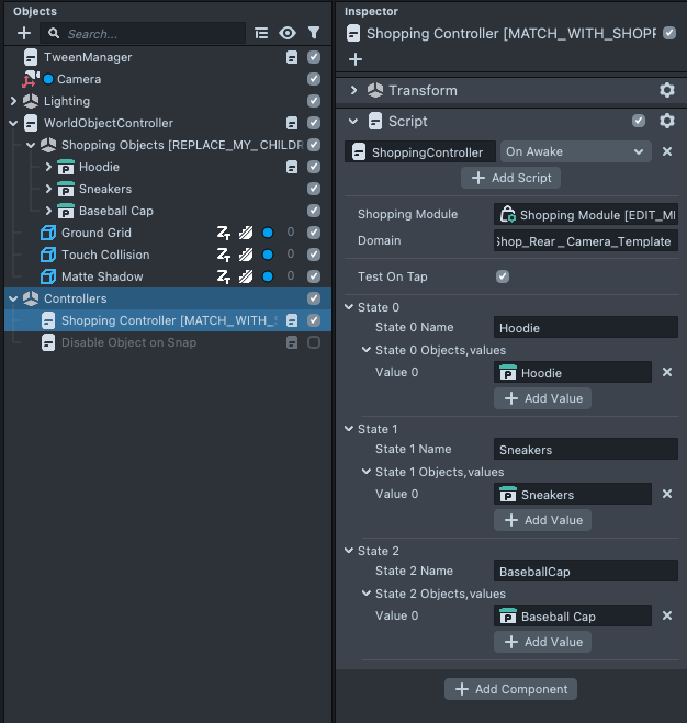 Now we’ll connect it to the Shopping Controller so the template knows how to refer to it. Select the Shopping Controller object, then in the Inspector panel, click on the field next to the Values section of State 2 (where the baseball Cap object was). We’ll update the state name to our new product as well.