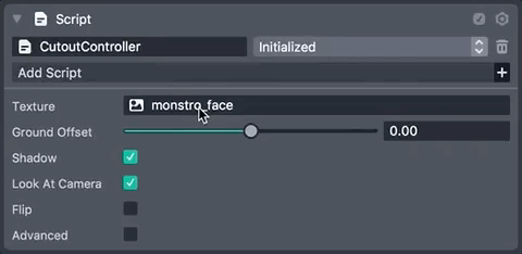 With the CutoutController [EDIT_ME] object selected, you can configure its settings in the Inspector panel. First, click the Texture field and set it to your newly imported Texture resource.